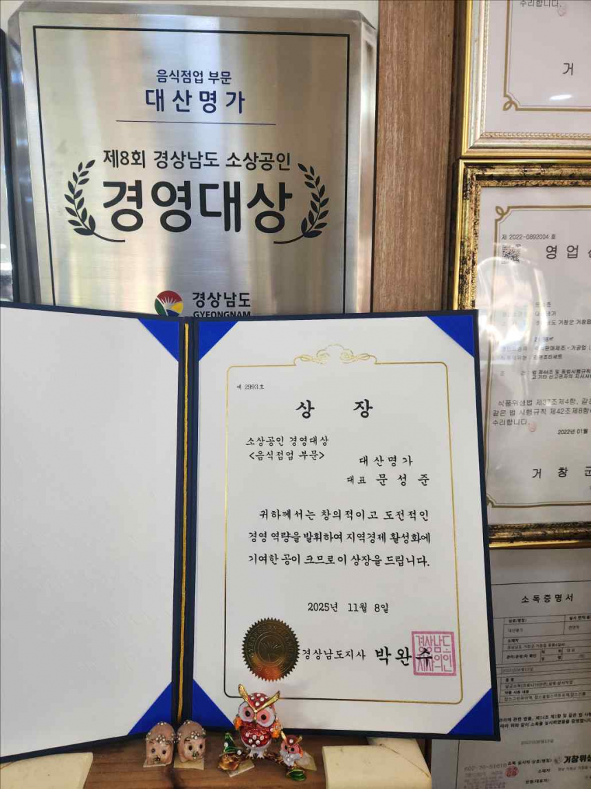 거창읍 동동4길에 위치한 대산명가가 ‘2025년 경상남도 소상공인 경영대상’에서 영예의 대상을 수상했다.