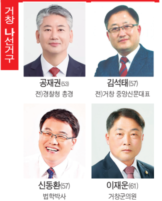 제1지구(상림리 제외 거창읍)에는 박주언 (현)도의원과 성창헌(현)국민의힘 경남도당 부대변인 등 2명이 신청했으며, 제2지구(거창읍 상림리, 주상·웅양·고제·북상·위천·마리·남상·남하·신원·가조·가북면)에는 공재권(전)경찰청 총경, 김석태 (전)거창중앙신문 대표, 신동환 법학박사, 이재운 (현)거창군의회 의장 등 4명이 신청했다. 이번 국민의힘 도의원 공천 신청자들의 성향은 다양하다.